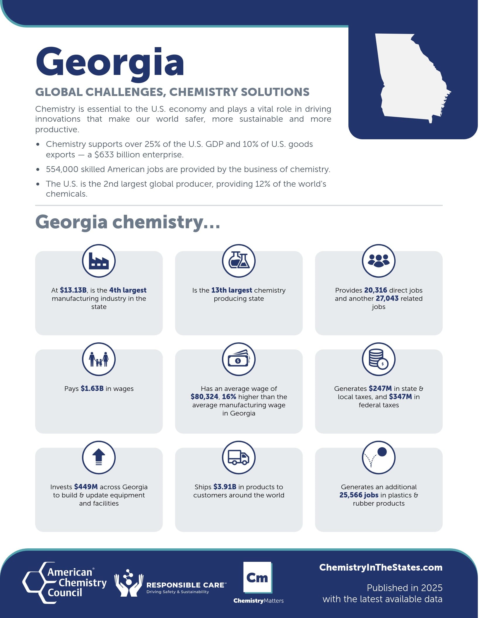 With nearly all manufactured goods being touched by the business of chemistry, our industry is important in some facet to every state in our country. The business of chemistry is a $639 billion enterprise and a key element of the nation’s economy. Supporting more than 25 percent of the U.S. GDP, chemistry is one of the nation’s largest manufacturing sectors, and the chemistry sector provides 555,000 skilled, good-paying jobs throughout the U.S.